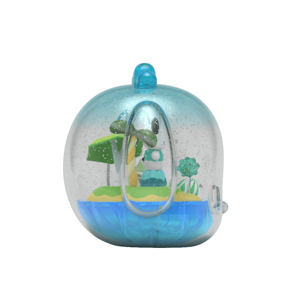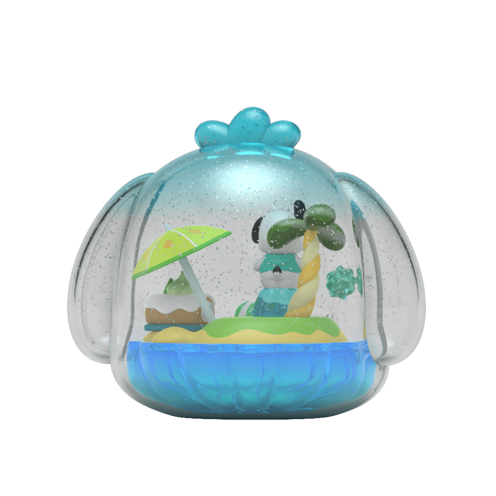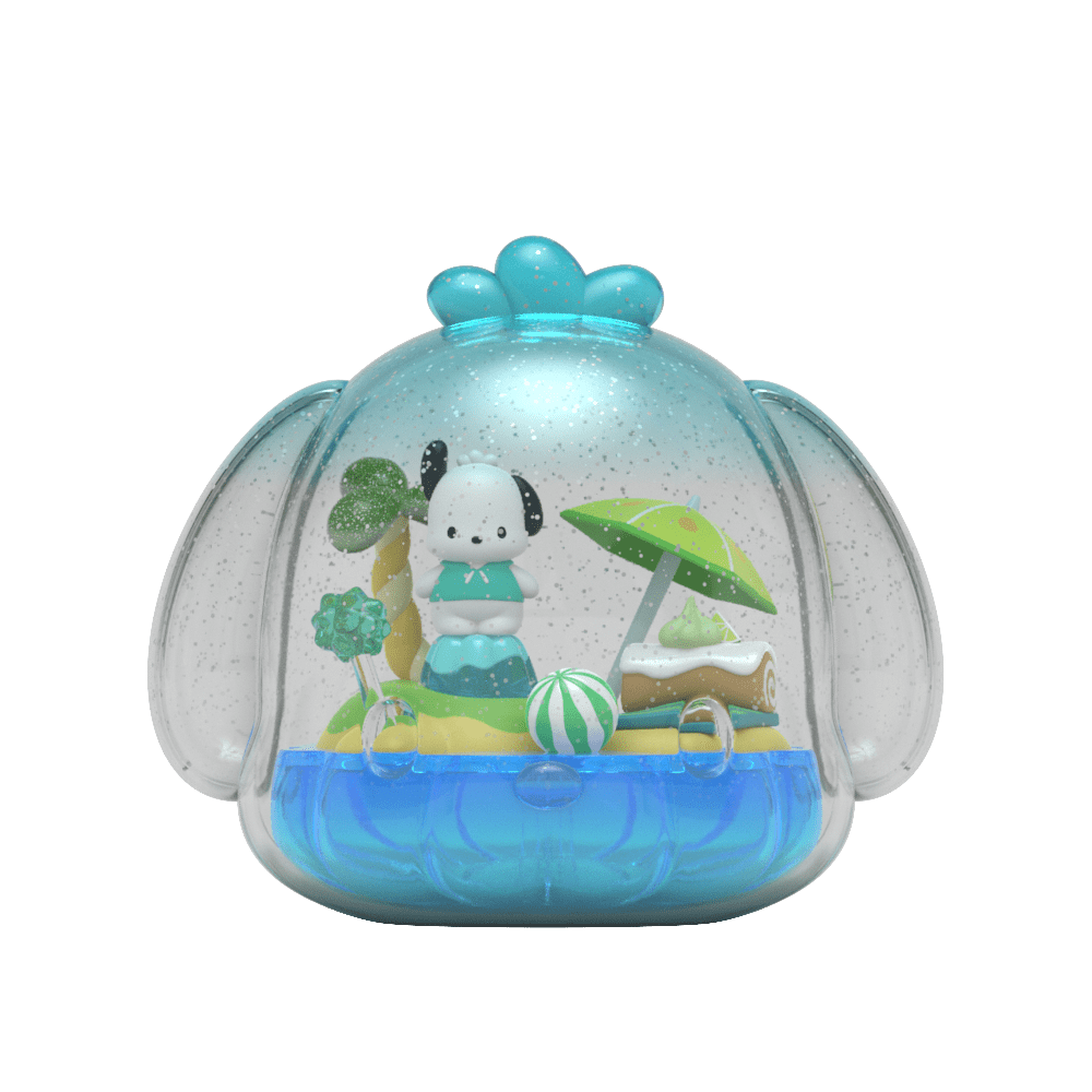 Set within a glitter-filled globe, Pochacco is depicted lounging under a green beach umbrella, surrounded by sandy shores and playful beach accessories like a beach ball, surfboard, and tropical drinks. The top of the globe is adorned with a bright blue bow, reminiscent of the clear summer skies, adding an extra touch of charm to this captivating scene.