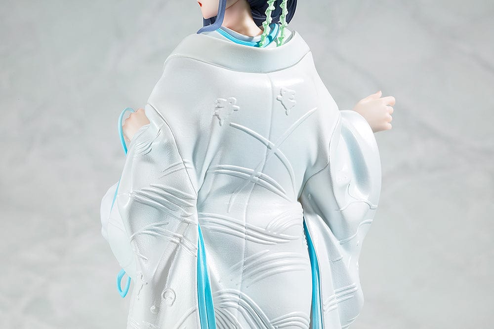 This figure captures Mai in a beautifully detailed white kimono, adorned with subtle floral patterns and accented with serene blue ribbons that enhance her gentle demeanor. Her pose, looking back over her shoulder with a soft gaze, adds a layer of inviting mystery. Each element, from the delicate flower in her hair to the intricate textures of her kimono, has been crafted with precision, reflecting Mai's refined and composed character. This figure is a masterpiece of craftsmanship, making it a must-have for fans and collectors alike, seeking a touch of traditional beauty mixed with modern anime charm.